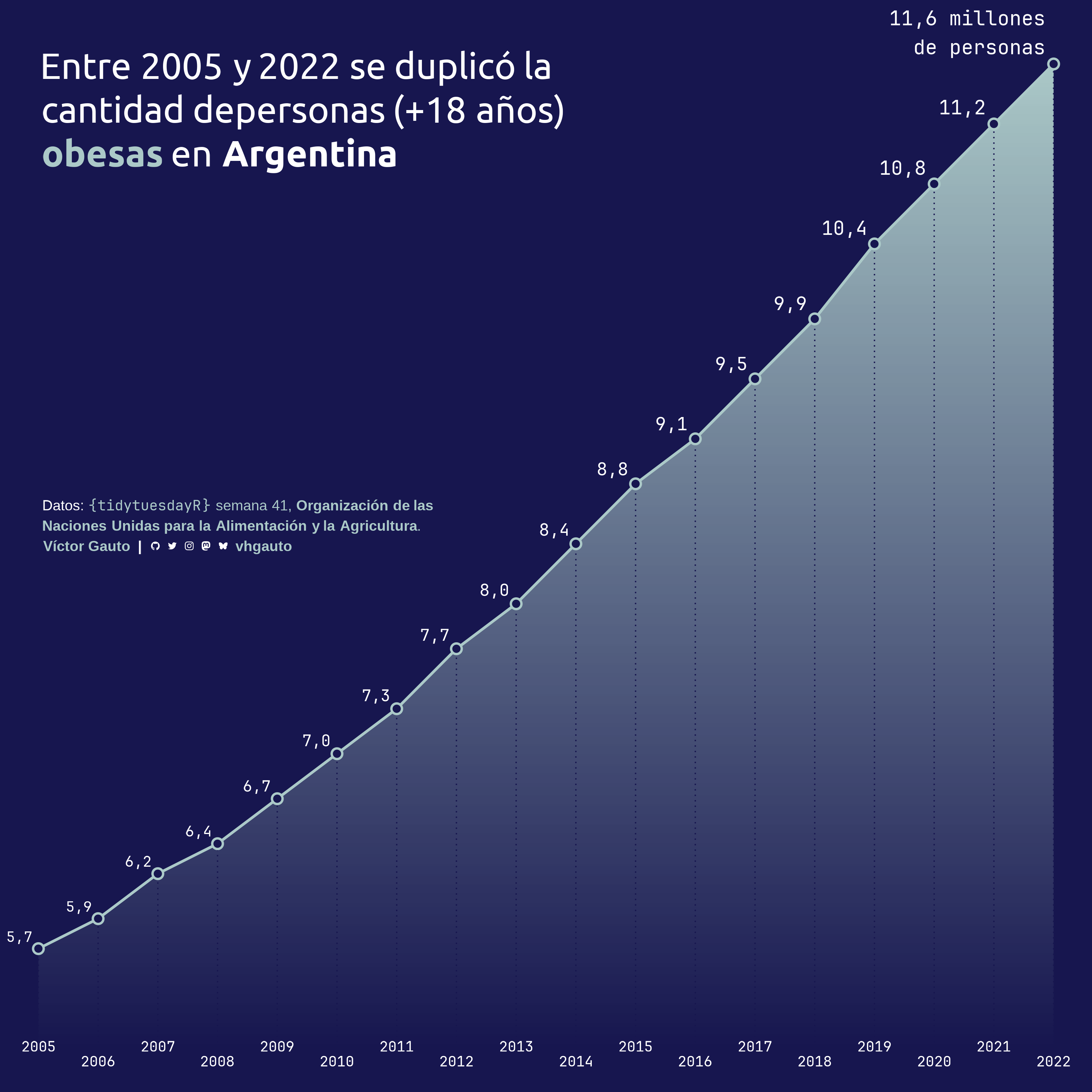 Me interesa la evolución anual en la cantidad de adultos obesos. Agrego formato a los números e indico las unidades.