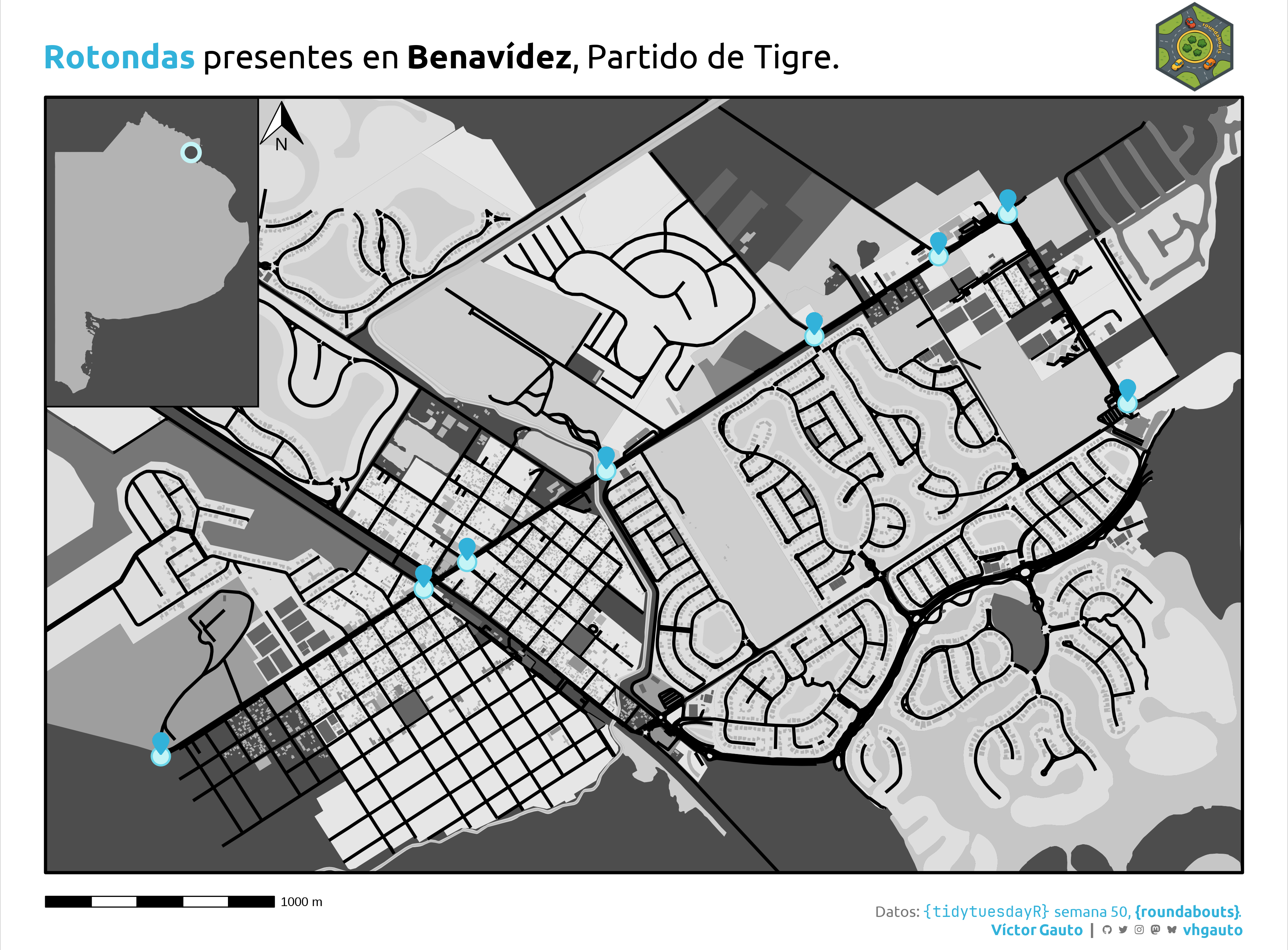 )Me interesa crear un mapa de Benavidez mostrando las rotondas presentes. Los componentes del mapa provienen de Open Street Map.