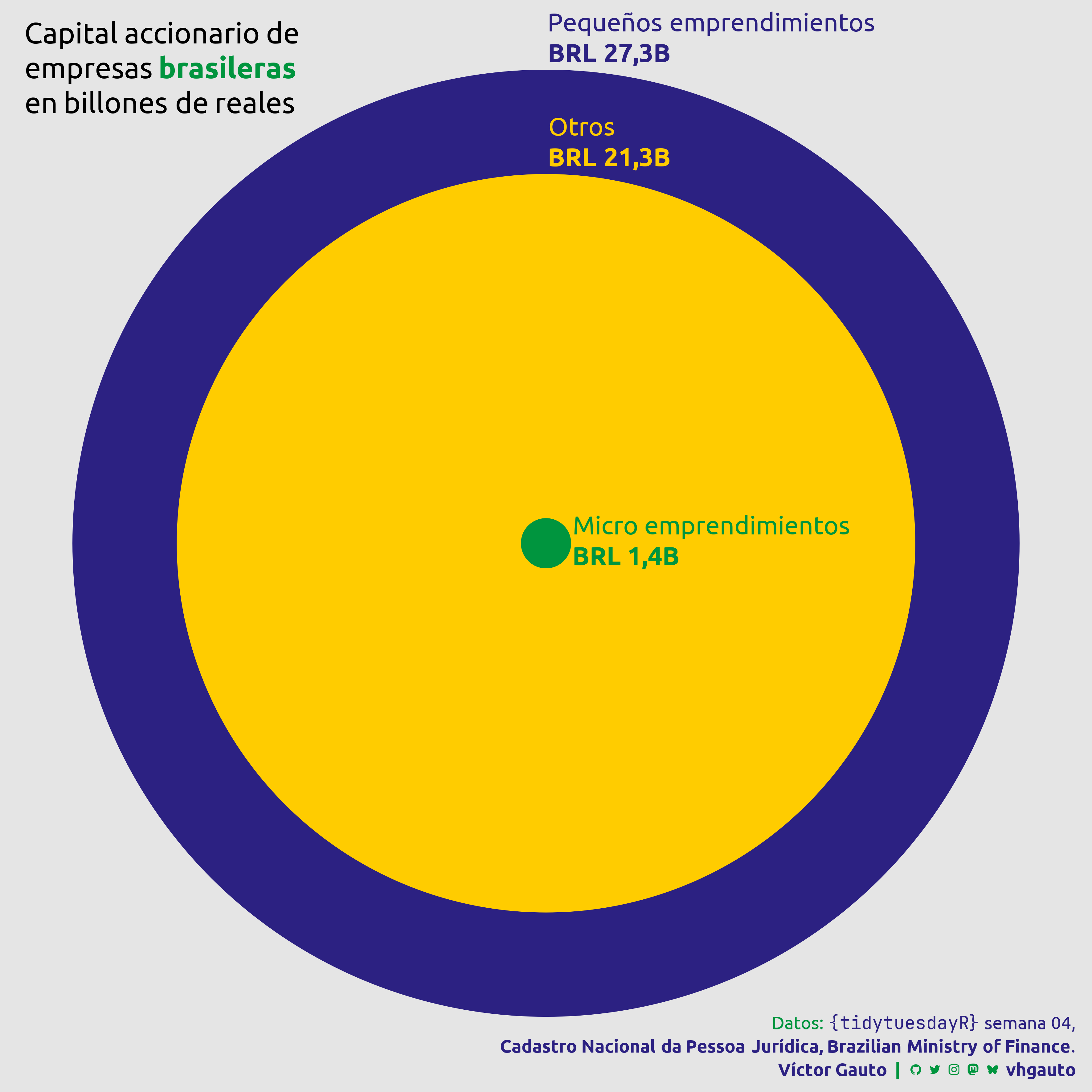 Me interesa comparar el capital accionario de las empresas por tamaño de empresa, como círculos concentricos de radio proporcional al capital.